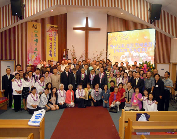 미 하나님의 성회(AG) 한국총회(총회장 이광희 목사) 제32차 정기총회가 178명이 참가한 가운데 "은혜와 보답"(시편 116:12)을 주제로 4월 22일부터 25일까지 하와이 백향목교회에서 열리고 있다. 한인총회에는 7개 지방회에 142개 교회, 목사회원 228명과 전도사 회원 66명이 속해있다.