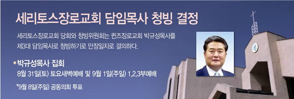 남가주에 있는 세리토스장로교회가 박규성 목사(53세)를 3대 담임목사로 청빙했다. 세리토스장로교회는 2대 담임 김한요 목사가 지난 6월 베델한인교회로 자리를 옮기자 '개혁주의 신앙이 확고한' 담임목사를 청빙해 왔다. 세리토스장로교회는 9월 1일 박규성 목사를 초청하여 주일설교를 들으며, 8일에는 공동의회를 통해 담임목사로 결정하는 과정을 남겨두고 있다.