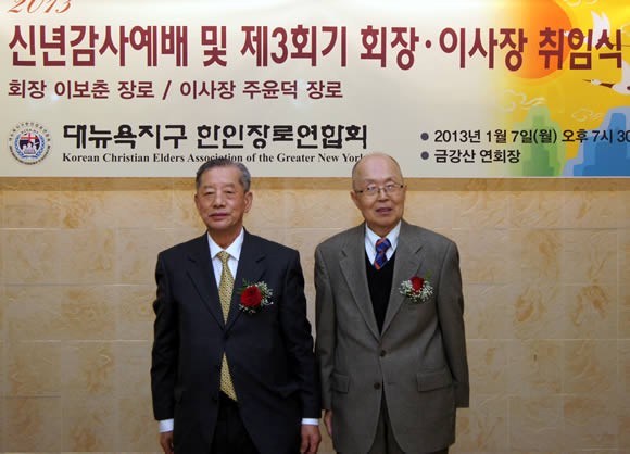 대뉴욕지구 한인장로연합회 신년감사예배 및 제3회기 회장 이보춘 장로와 이사장 주윤덕 장로 취임식이 1월 7일(월) 오후 7시30분 금강산 연회장에서 열렸다. 대뉴욕지구 한인장로연합회는 교단을 초월해 2010년 11월 창립총회를 가졌다. 회원의 자격은 교협이 인정하는 건전한 교단에 속한 대뉴욕지역에 산재한 한인교회에 출석하는 장로이다.