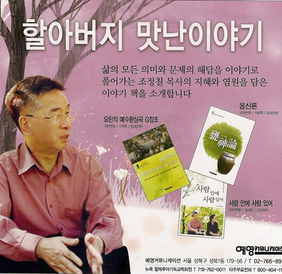 조정칠 목사는 이번에 예영출판사에서 <옹신론(甕神論)>, <요한의 예수환상곡 G 장조>, <사람안에 사람있어>등 3권을 냈다. 조 목사의 저서는 20권이 됐으며, 앞으로 계속 쓸 것이라고 밝혔다.