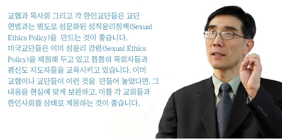 여러가지 방안중에서도 우선 교협과 목사회 그리고 각 한인교단들은 교단 헌법과는 별도로 성문화된 성윤리 정책(Sexual Ethics Policy)을  만드는 것이 좋습니다. 미국교단들은 이미 성윤리 정책(Sexual Ethics Policy)을 제정해 두고 있고 틈틈히 목회자들과 평신도 지도자들을 교육시키고 있습니다. 이미 교협이나 교단들이 이런 것을  만들어 놓았다면, 그 내용을 현실에 맞게 보완하고, 이를 각 교회들과 한인사회를 상태로 계몽하는 것이 좋습니다.