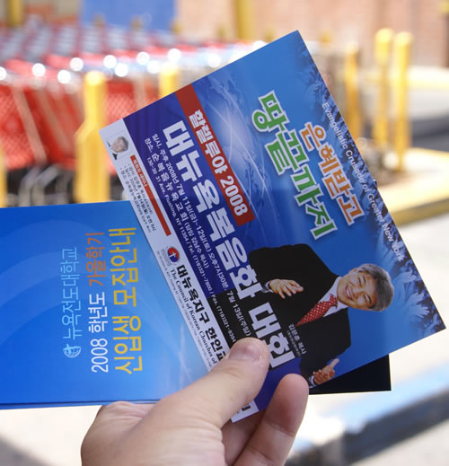 한아름, 한양, 플러싱 공영주차장 일원에서 9일(수)부터 진행된 전도에는 전도대학 학생들이 2-3명씩 배치되어 할렐루야대회 광고지와 전도대학 안내서를 나누어 주었다.