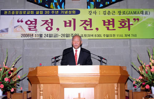 퀸즈중앙장로교회(담임 안창의 목사)는 교회설립 30주년을 맞아 김춘근 장로(JAMA대표)를 초대하여 11월24일(금)부터 3일간 "열정, 비전, 변화"라는 주제로 성회를 열고 있다.