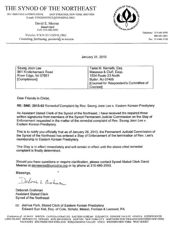 이승준 목사는 노회의 노티스를 미리 받지 못했고, 본인이 없는 자리에서 제명을 한 노회의 결정은 문제가 있다며 노회 상위기관인 대회에 문제를 제기했다. 대회는 1월 29일자로 이승준 목사의 제명에 대해 집행유예 결정을 내려 즉시 이 목사는 노회원 신분을 회복했다. 하지만 대회의 결정은 노회의 제명결정을 뒤집는 판결은 아니다. 이제부터 본격적인 재판이 시작된다. 이승준 목사는 한소망교회에 대한 노회의 결정에 대해서도 대회에 제소하여 재판시작 결정을 기다리고 있다.