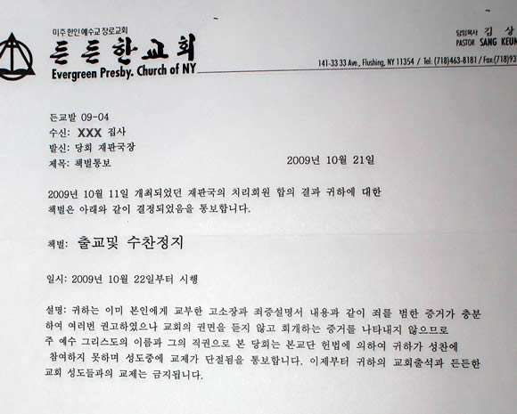 든든한교회가 속한 미주한인예수교장로회 헌법은 책벌의 종류로 권계, 견책, 정직, 면직, 수찬 정지, 제명, 출교등 7가지가 있다. 이중 가장 엄한 벌인 '출교'는 끝내 회개하지 아니하는 자에게만 한다고 되어 있다.