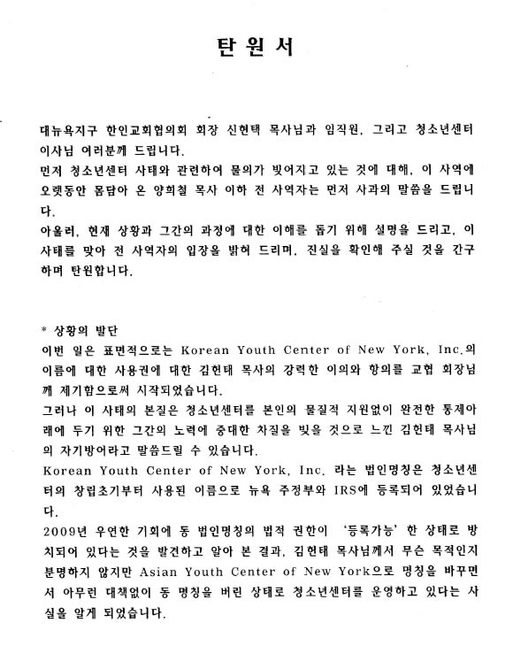 대뉴욕지구 한인교회협의회 회장 신현택 목사님과 임직원, 그리고 청소년센터 이사님 여러분께 드립니다. 먼저 청소년센터 사태와 관련하여 물의가 빚어지고 있는 것에 대해, 이 사역에 오랫동안 몸담아 온 양희철 목사 이하 전 사역자는 먼저 사과의 말씀을 드립니다.