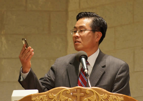 또 "인텔은 메모리 중심의 기업이었지만 경쟁으로 위기상황 속에 있었다. CEO는 새로운 CEO가 오면 가장 먼저 고려할 것이 무엇인가를 스스로 물었다. 그리고 메모리 사업을 버리고 크게 성장했다. 마찬가지로 여러분들도 교회에서 쫓겨나고 새로운 담임목사나 장로가 온다면 무엇을 할 것인가를 스스로 묻고 그대로 행하라. 아이팟의 버튼을 누르면 초기화면이 나오는 것처럼, 첫 담임목사 부임시절과 첫 임직할 때를 기억하라. 초기화면으로 돌아가 다시 한 번 시작하라"고 부탁했다.