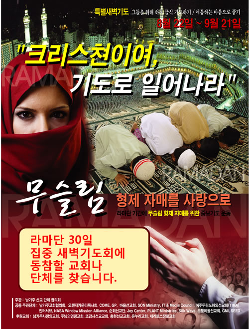 전세계 16억 무슬림들은 매년 30일간 ‘라마단 금식기도’를 한다. 무슬림의 5대 신앙 강령중의 하나인 라마단 금식기간(올해 8월 22일-9월20일)동안에 기독교인들이 이스람을 위해 중보기도를 하고 있다.