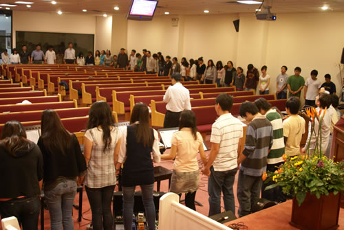 말씀후 백여명의 교육팀은 손을 잡고 예배당을 둘러서서 선교를 위해 통성기도를 했다. 이어 4개 팀으로 나누어 교육을 받았다. 팀의 대표는 경험이 많은 평신도 중심이다.