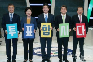 더불어민주당 문재인(왼쪽부터), 정의당 심상정, 바른정당 유승민, 국민의당 안철수, 자유한국당 홍준표 대선후보가 28일 오후 서울 상암동 MBC 스튜디오에서 선거관리위원회 주최로 열린 생방송 토론을 시작하기 앞서 투표참여 독려 피켓을 들고 있다. (국회사진취재단) 황진환기자