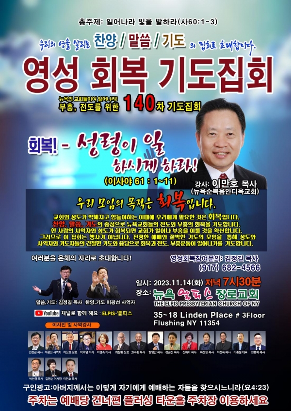 교회와 성도가 약해지고 힘들어하는 이때에 우리에게 필요한 것은 회복입니다. 찬양, 말씀, 기도의 중심으로 뉴욕 교회들의 전도와 부흥의 회복을 기도합니다.한 사람의 사역자와 성도가 모이며 찬양, 말씀, 기도가 회복되어 은혜가 넘쳐날 때 우리가 응답받고 회복됨을 믿습니다. 우리 함께 기도의 불을 일으킵시다!!