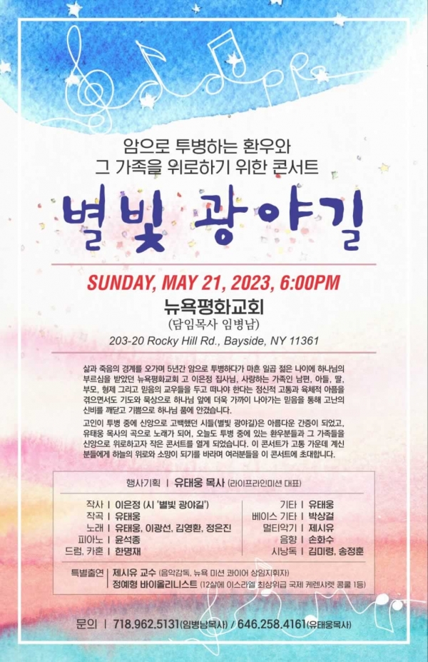 긴 암투병 끝에 47세 나이에 하늘의 별이 되어 버린 고.이은정 집사의 작은 한권의 시집 ‘별빛 광야 길’을 받은 그날, 시에 귀를 기울여 보니 너무도 애절한 마음과 주님을 향한 절절한 글 하나 하나가 제 마음을 흔들어 놓았고, 고통을 가진 가족들을 위로하기 위한 ‘공감 콘서트’를 해야겠다는 생각을 하게 되었습니다. 그날 이후 2주 동안에 여섯곡을 작곡하게 되어, 고인의 마지막을 보낸 교회(뉴욕평화교회)에서 5월 21일 주일에 투병 중에 있는 가족들을 위로하기 위한 콘서트를 하고자 합니다.
