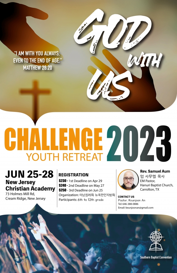 “Challenge 2023 Youth Retreat”을 위하여 많은 기도와 격려를 부탁 드리며 여러분의 모든 청소년 자녀들을 초청합니다.