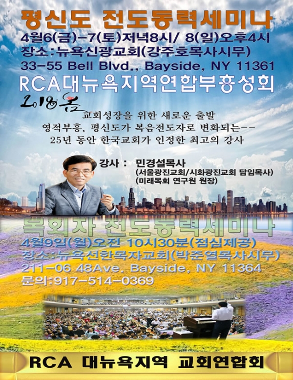 RCA대뉴욕지구교회연합회는 4월 6~8일(6~7일 저녁8시, 8일 오후 4시)까지 뉴욕신광교회에서 연합부흥성회를 통하여 평신도 전도동력 세미나, 4월 9일(10시30분)에는 뉴욕선한목자교회에서 목회자 전도동력 세미나를 개최한다.
