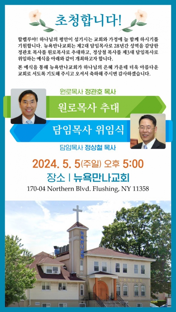 뉴욕만나교회 정관호 목사 추대, 정상철 담임목사 위임식