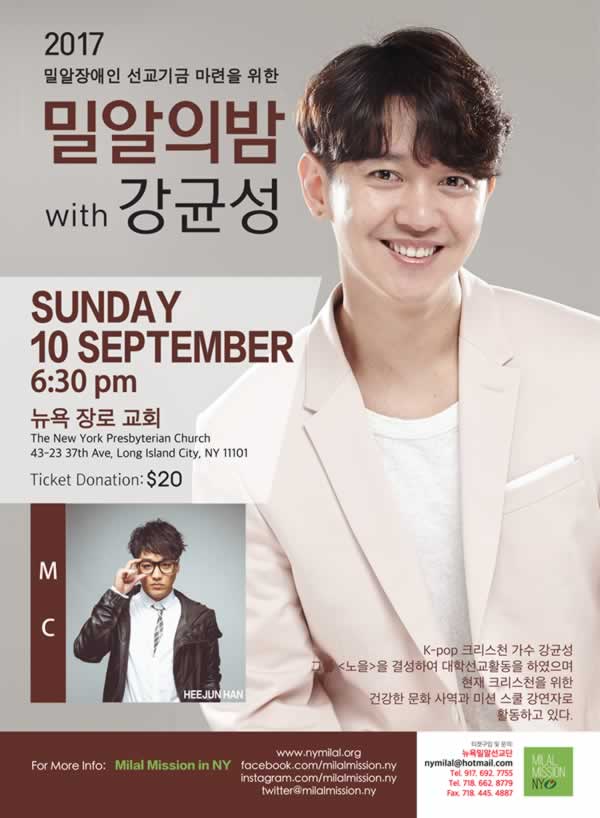뉴욕밀알 선교단은 2017년 ‘밀알의 밤(The Milal Night)’ 행사를 개최합니다. 올해는 크리스천 K-pop 가수 강균성을 초대하여 그리스도인의 교제를 갖고 지역사회에 사랑을 전하는 시간으로 기획했습니다.
