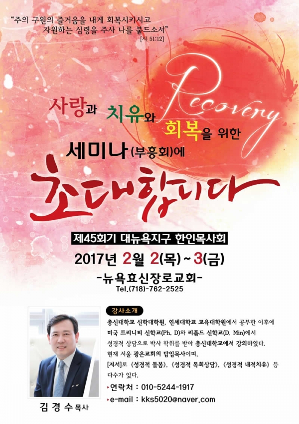 금번 뉴욕목사회에서는 1차 임. 실행위원회 및 신년기도회와 목회자 세미나(기독교 이상심리학)을 아래와 같이 열고자 하오니 회원 목사님들께서 많이 참석하시어 목회사역에 유익한 정보(45 page. 자료)를 함께 공유할 수 있으시길 바랍니다.
