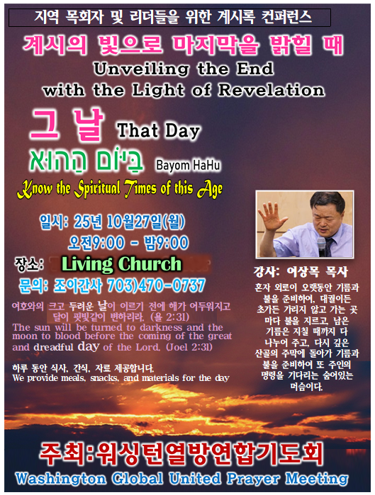 워싱턴 열방연합, 이상목목사 강사로 계시록 컨퍼런스 개최(25년 10월27일)