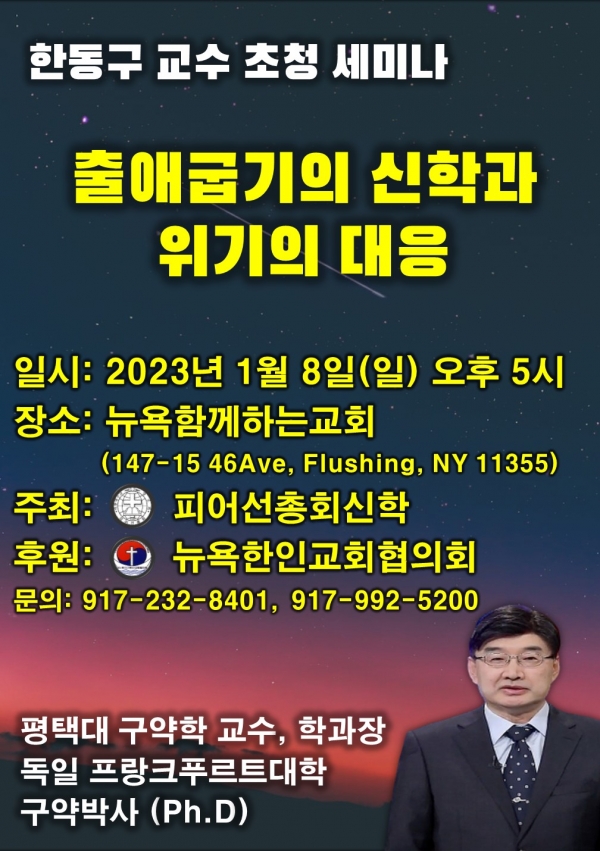 한동구교수(평택대 구약학) 초청 신년세미나 페이지 정보 뉴욕함께하는교회ㆍ2022-12-22 관련링크 이전글 다음글 목록 본문 . 댓글목록 등록된 댓글이 없습니다. 이전글 다음글 목록