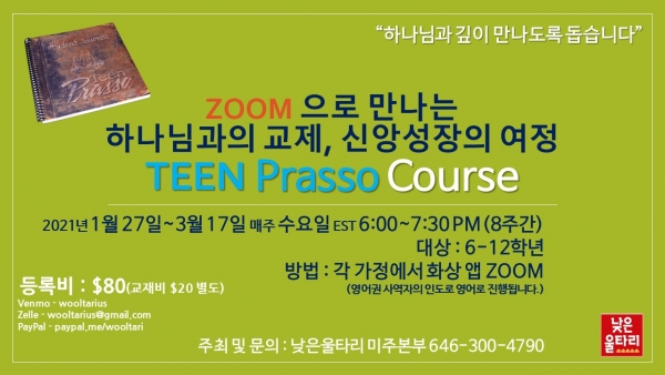 낮은울타리 미주본부(대표 : 조희창 목사)에서 지난해 여름 뜨거운 반응가운데 진행되었던 Teenager 자녀들을 위한 <Zoom으로 만나는 Teen Prasso Course>를 2021년을 시작하며 열게 되었습니다.