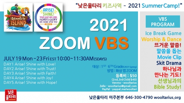 낮은울타리 미주본부(대표간사 : 조희창 목사)에서 어린이를 위한 <2021 ZOOM VBS(Summer Camp)>를 엽니다.