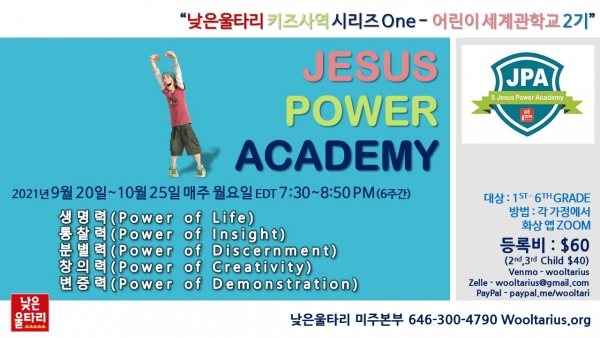 낮은울타리 미주본부(대표간사 : 조희창 목사)에서 ZOOM으로 만나는 어린이 세계관 학교 <JESUS POWER ACADEMY> 2기를 엽니다.