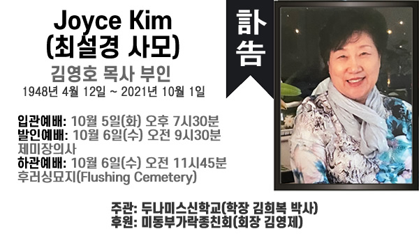 미동부크리스천아케데미, 미동부생명의전화 원장 김영호 목사의 아내이자 동역자 Joyce Kim(최설경, 73세) 사모가 2021년 10월 1일 하나님의 부름을 받았기에 아래와 같이 장례예배를 드리게 됨을 알려 드립니다.