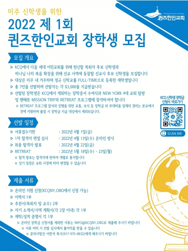 이번에 퀸즈한인교회는 다음 세대 이민교회를 위해 헌신할 신학생과 선교사역에 준비하시는 선교사 후보 신학생을 대상으로 장학생을 모집합니다.