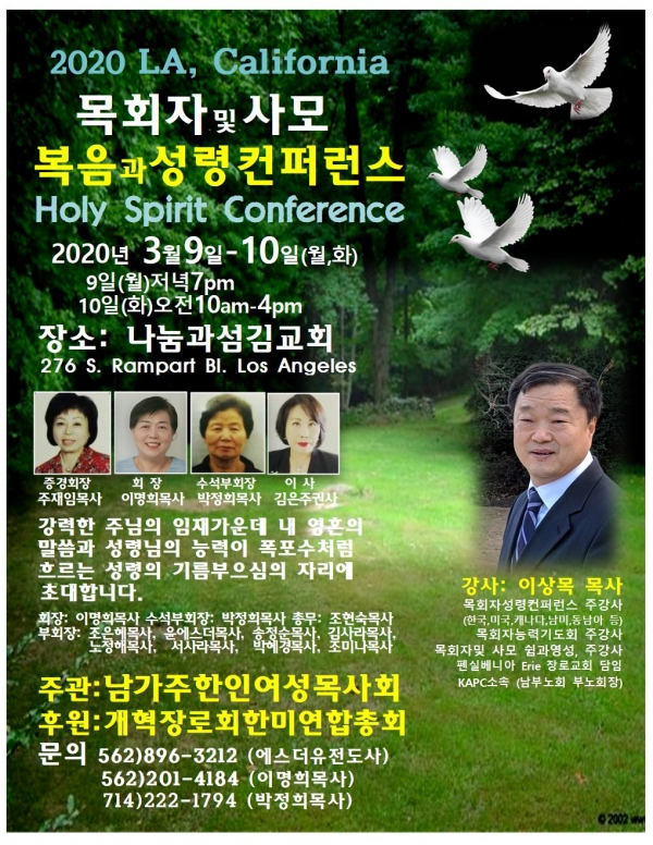 남가주한인여성목사회 주최로, 개혁장로회 한미연합총회 후원으로, 복음과 성령 컨퍼런스가 2020년 3월 9일(월) 오후 7시, 10일(화) 오전 10시부터 4시까지 나눔과섬김교회 (276 S. Rampart Bl. Los Angeles)에서 열린다.