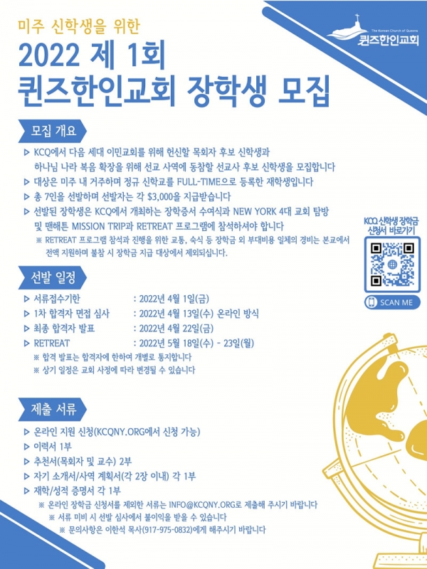 장학금 신청은 퀸즈한인교회 홈페이지(www.kcqny.org)를 참고해 신청을 할 수 있다. 마감일은 2022년 4월 1일(금)이며 문의는 이한석 목사(hanseok.lee@kcqny.org)에게 하면 된다.
