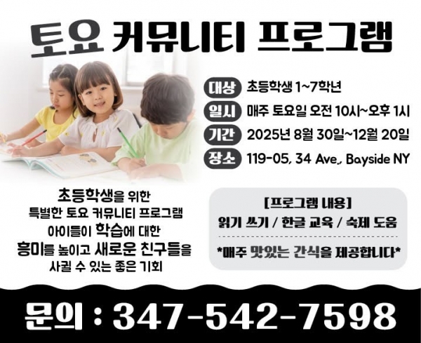 안녕하세요! 초등학생을 위한 특별한 토요 커뮤니티 프로그램에 여러분을 초대합니다. 이 프로그램은 아이들이 즐겁게 배우고 성장할 수 있는 기회입니다.