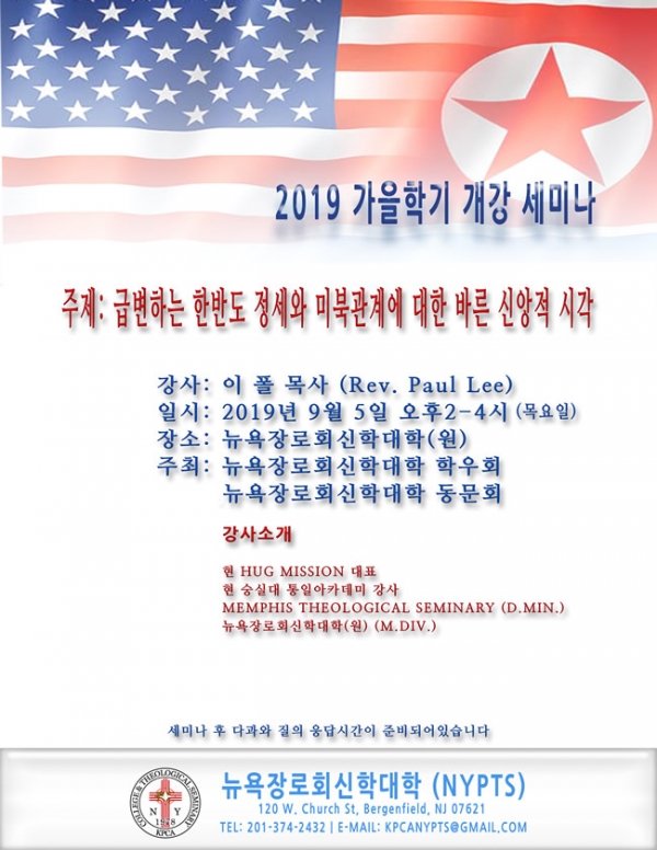 할렐루야! 주님의 이름으로 문안드립니다. 2019년도 가을학기 개강을 앞두고 본교에서는 한반도와 미국의 관계를 신앙적 시각으로 재해석하여 강연하시는 이 폴 박사님을 모시고 “급변하는 한반도 정세와 미북관계에 대한 바른 신앙적 시각”이란 주제로 세미나를 준비하였습니다.