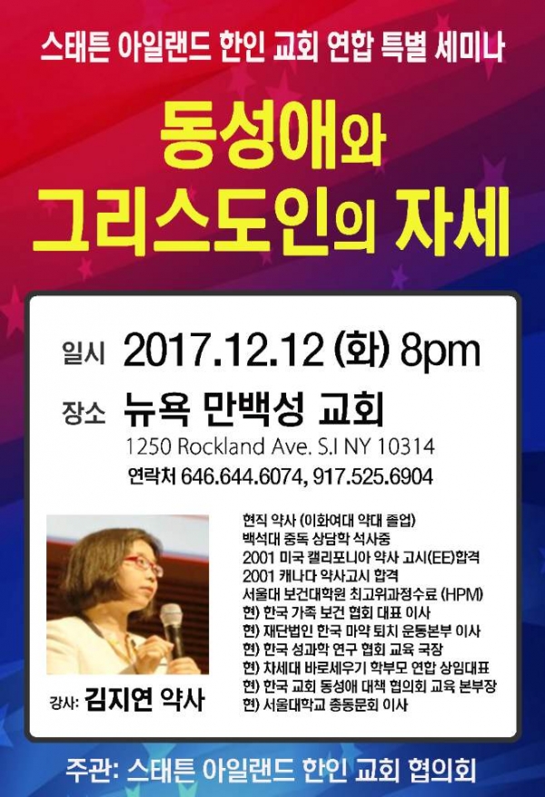 스태튼 아일랜드 한인 교회 협의회(SIKCA)에서는 김지연 약사를 초청하여 이 시대의 중대이슈인 "동성애와 그리스도인의 자세" 라는 제목으로 교회협의회 주관으로 연합 특별세미나를 갖는다.
