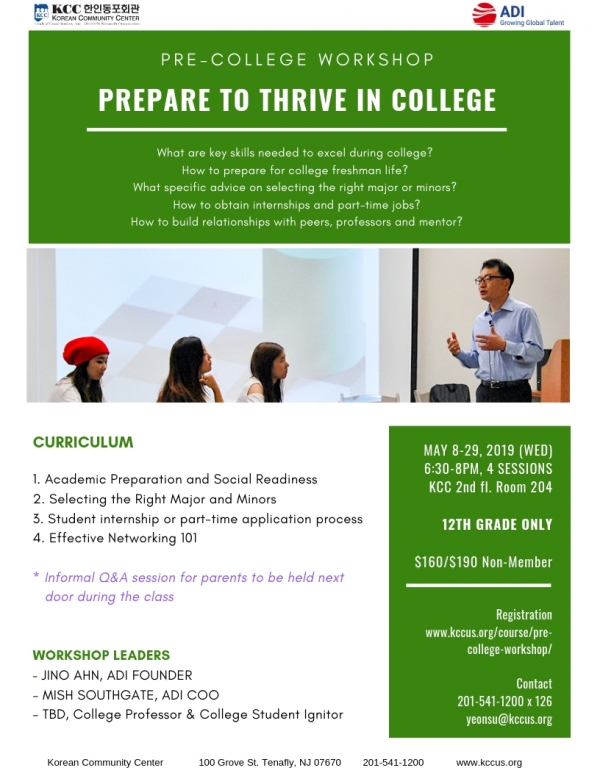 자녀들의 즐겁고 유익한 대학 생활을 위하여 예비 대학생을 위한 대학 생활 준비 워크샵이 5월 8일부터 4주간 매주 수요일 저녁 6시 30분 KCC 한인 동포 회관에서 진행됩니다.