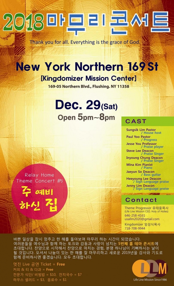 다섯번째 홈 테마 콘서트를 12월의 마지막 토요일 29일 오후 5시에 노던 169가 에서 열립니다. 이번에는 누구든지 오실 수 있도록 오픈된 상태에서 진행하오니 많이 참여하셔서 찬양으로 시작해서 찬양으로 마치는 은혜의 시간이 되시길 바랍니다.