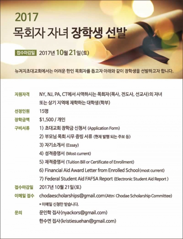 뉴저지초대교회 - 2017 목회자 자녀 장학생 선발