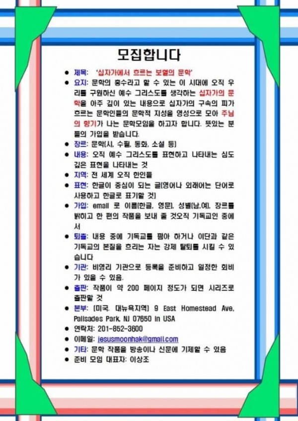 가입: email 로 이름(한글, 영문), 성별(남,여), 장르를 밝히고 한 편의 작품을 보내 줄 것 (오직 건전한 기독교인 중에서)