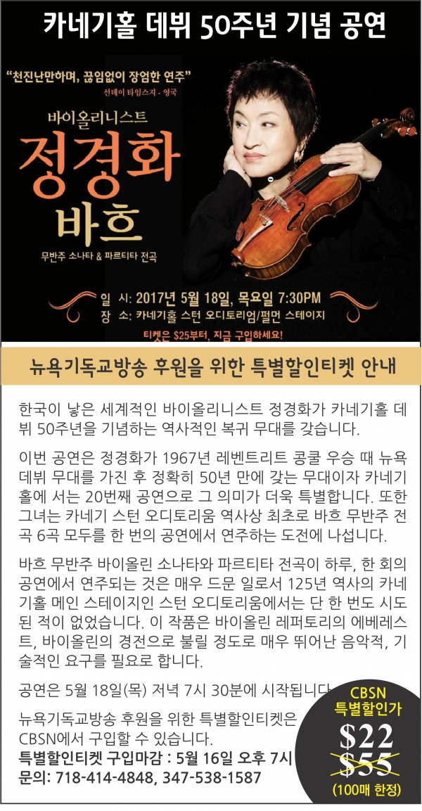공연은 5월 18일(목) 저녁 7시 30분에 시작된다. 티켓은 카네기홀 홈페이지(www.carnegiehall.org)나 박스오피스에 구입할 수 있으며 뉴욕기독교방송 후원을 위한 특별할인티켓은 CBSN에서 구입할 수 있다. 구입마감 5월16일 오후 7시