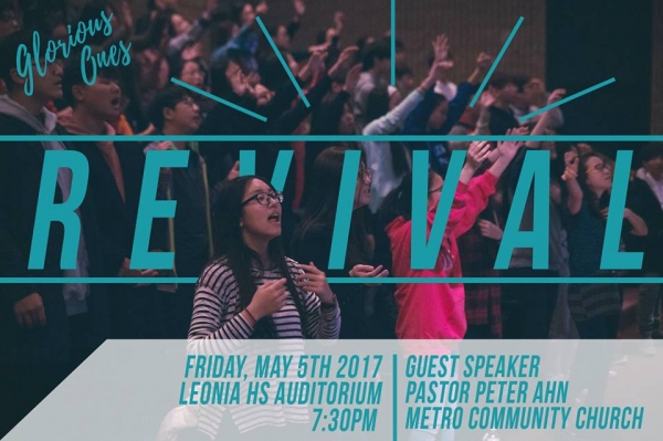 이번주 금요일(5월 5일) 저녁 7시30분에 영어권 Youth와 EM 청년들을 위한 Revival 이 있습니다.(Place : Leonia High School 600 Willow Tree Rd, Leonia, NJ) 이번 Revival에는 메트로교회 피터안 목사님이 강사로 오십니다. 뜨거운 찬양과 강력한 말씀이 선포될 것입니다. 이 부흥회는 6학년이상 Youth & EM, 어느교회 누구나 참여할 수 있습니다. 위해서 많은 기도와 참여바랍니다.