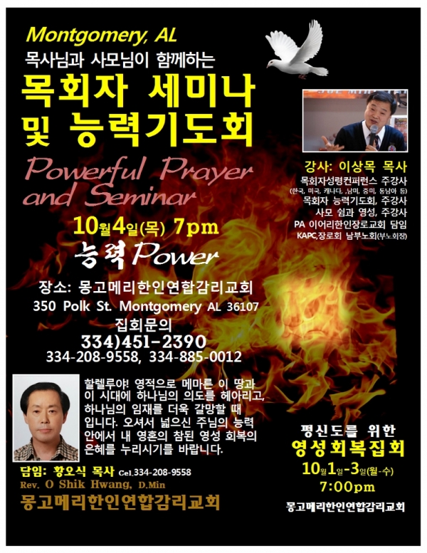이상목목사 초청, 몽고메리지역 목회자 세미나 및 영성회복집회를 몽고메리한인연합감리교회 (담임: 황오식)에서 개최한다.