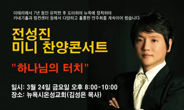전성진 미니 콘서트는 "하나님의 터치"란 주제로 이민자들의 삶과 하나님께 대한 열망을 하나로 묶어 내려는 찬양 간증을 담고 있습니다. 전성진은 이태리에서 7년 동안 유학한 후 도미하여 뉴욕에 정착하여 카네기홀과 링컨센터 등에서 다양하고 훌륭한 연주회를 계속이어 왔습니다. 이번 미니 찬양 콘서트는 우리에게 주신 주님의 영적 치유와 은혜가 풍성한 찬양 간증의 시간이 될 것입니다. 이 귀한 은혜의 자리에 여러분을 초대합니다.