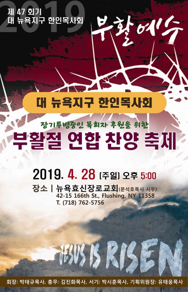제47회기 대뉴욕지구한인목사회에서는 「장기투병중인 목회자 후원을 위한」 부활절연합찬양축제를 아래와 같이 열고자 하오니 회원 목사님들과 회원교회 성도님들의 많은 관심과 참석을 부탁드립니다. 또한 가장 관심과 도움이 필요하지만 가장 소외되고 계시는 많은 ‘목회자’분들을 도울 수 있도록 $100 후원 운동에 동참하여 주시기 바랍니다.