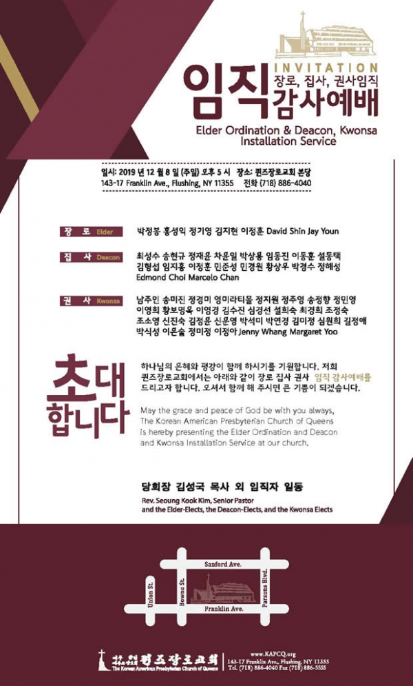 퀸즈장로교회 임직감사예배 페이지 정보 퀸즈장로교회ㆍ2019-11-14 관련링크 이전글 다음글 목록 본문 퀸즈장로교회 임직감사예배 댓글목록 등록된 댓글이 없습니다. 이전글 다음글 목록