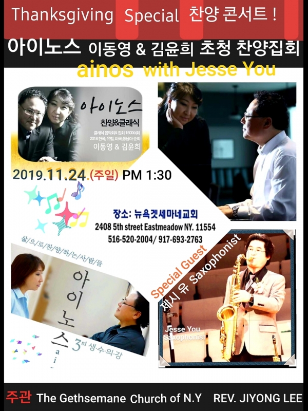 #클래식 찬양의 진수를 보여주는 #아이노스와 하나님을 향한 #심령의 연주자 #제시유교수와 함께하는 땡스기빙 #스페셜 찬양 콘서트 2019년 11월 24일 11시와 1시30분에 롱아이랜드 뉴욕 #겟세마네교회(담임 이지용목사)에서 있습니다. 모두 환영합니다!