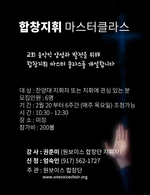 지휘에 대한 관심과 현재 찬양대 지휘를 하며 이를 보완하거나 개인의 발전을 원하는 분들을위한 마스터클라스입니다.