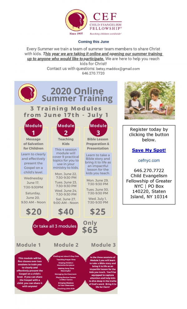 Every Summer we train a team of summer team members to share Christ with kids. This year we are taking it online and opening our summer training up to anyone who would like to participate. We are here to help you reach kids for Christ!
