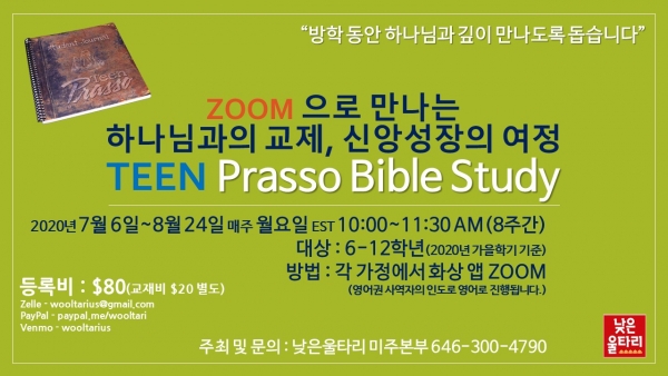 낮은울타리 미주본부(대표 : 조희창 목사)에서 Teenager 자녀들이 방학동안 하나님과 깊이 만나도록 돕는 "TEEN Prasso Bible Study" 과정을 화상앱 Zoom으로 엽니다.