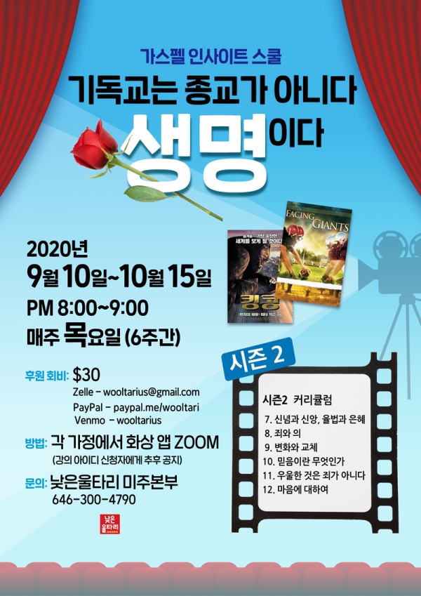 낮은울타리 미주본부(대표 : 조희창 목사)에서 영화로 복음을 변증하는 명쾌한 강의 <가스펠 인사이트 스쿨-시즌2>를 화상앱 ZOOM으로 엽니다.