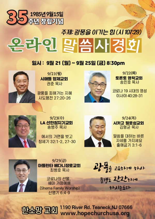 한소망교회는 올해 창립 35주년을 맞아 “광풍을 이기는 힘(시107:21)”라는 주제로 9월 21일(월)부터 25일(금)까지 저녁 8시30분 온라인 말씀 사경회를 개최합니다.
