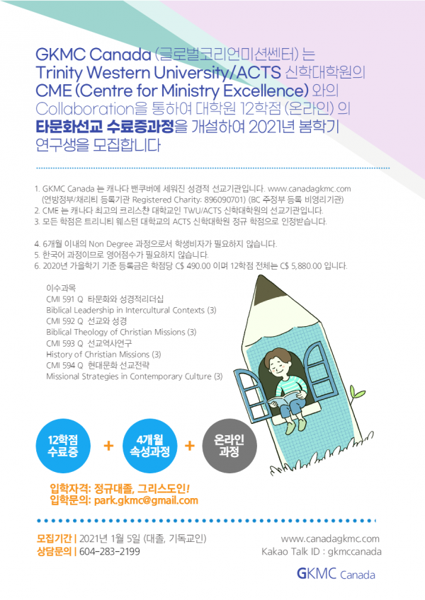 GKMC Canada (www.canadagkmc.com) 는 CME/ACTS/TWU 와의 Collaboration 을 통해 대학원과정 12 학점 수료과정을 시작하게 되었습니다. 2021년 봄학기 (1월부터 4월)에 1. 크리스챤 케어. 2. 타문화 선교. 3. 교회/기독교 음악. 수료과정을 개설하게 되었고 가을학기에는 기독교교육을 개설할 준비를 하고 있습니다. 하나님께 모든 영광을 돌립니다. 이제부터 본격적인 홍보를 시작할 것인데 많이 기도해 주시고 후원하여 주시기를 바랍니다.